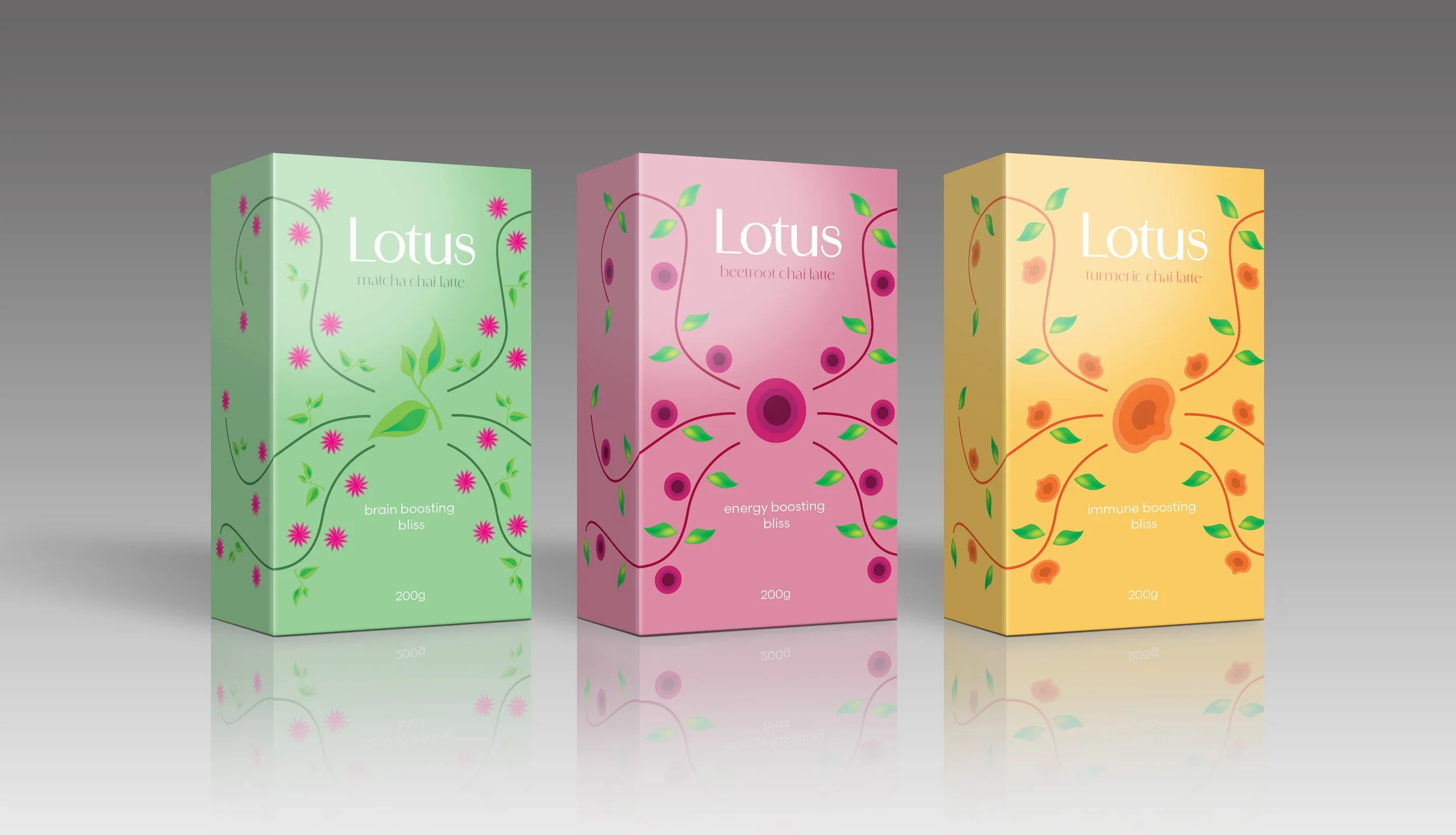 Packaging that pops! Each pack represents a different flavour of Chai in the Lotus Chai Latte range. The three distinct packs of chai have been designed with their raw ingredient in mind, resulting in packaging that is eye catching and fun.